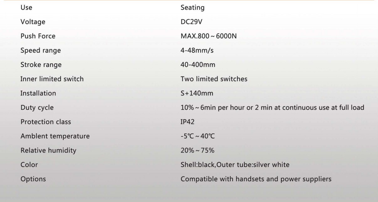 本產(chǎn)品已通過CE、UL、PSE、ISO9001認證,它有一個新穎的外觀和制作精良,噪音小,操作簡單,讓它成為暢銷國內(nèi)外,被廣泛用于電動沙發(fā)、醫(yī)療床、手術(shù)床,按摩椅等。