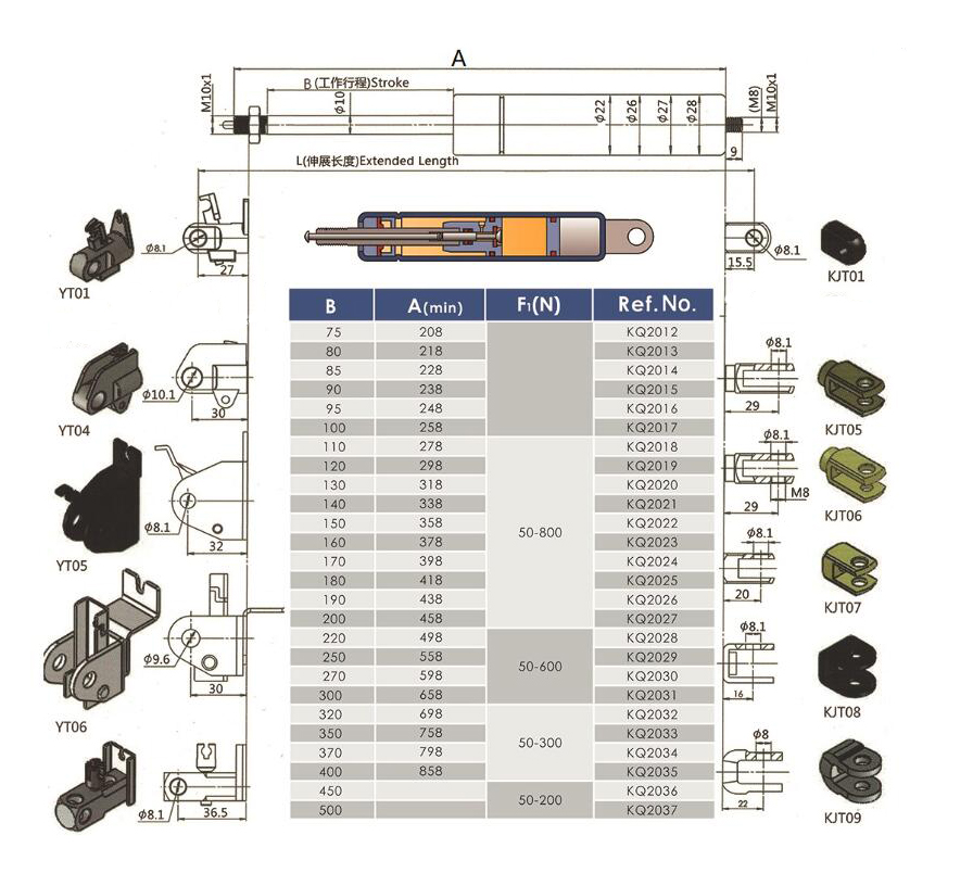 注:由于氣彈簧是非標(biāo)準(zhǔn)的,以上僅為型號(hào)的一部分。我們可以根據(jù)客戶的要求定制。